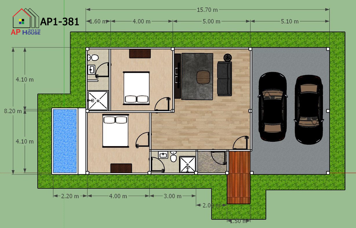 ขนาดตัวบ้าน : กว้าง 15.70 เมตร ลึก 8.20 เมตร