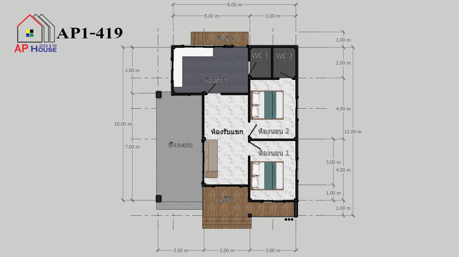 ขนาดตัวบ้าน : กว้าง 8.00 เมตร ลึก 10.00 เมตร