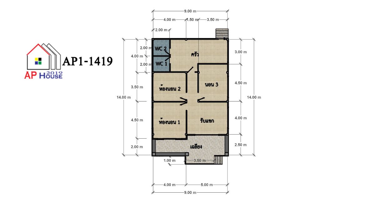 ขนาดตัวบ้าน : กว้าง 9.00 เมตร ลึก 14.00 เมตร