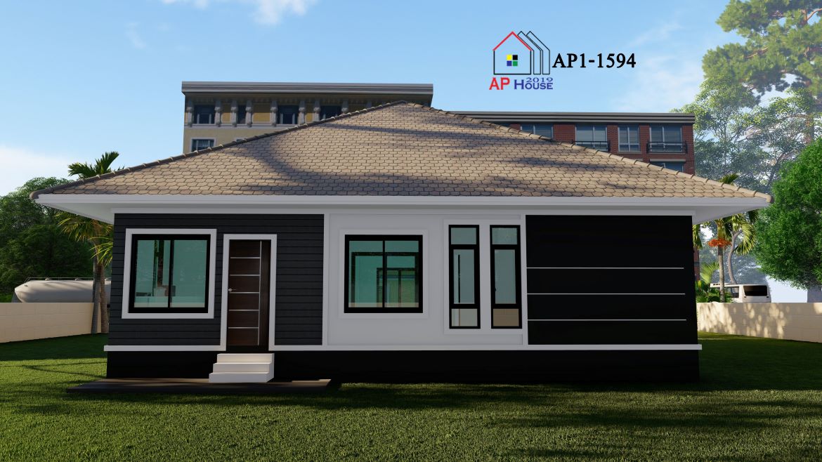 บ้านหลังคาทรงปั้นหยาสไตล์คอนเทมโพรารี่พื้นยกสูงเล็กน้อย ฟังก์ชั่นของตัวบ้านขนาด 3 ห้องนอน 2 ห้องน้ำ ตัวบ้านตกแต่งด้วยโทนสีเทาอ่อน ตัดกับสีเทาเข้มของฐานล่าง