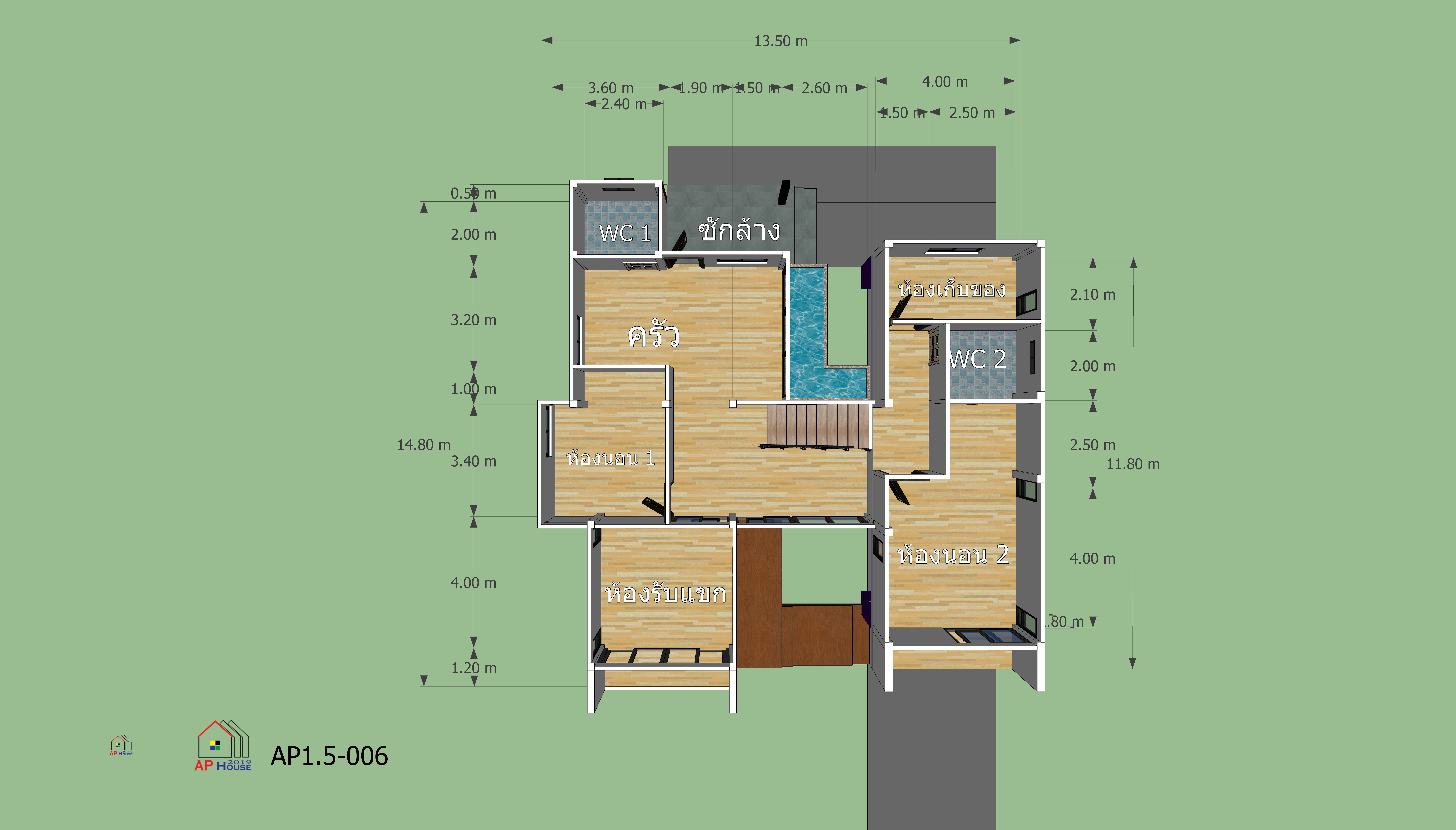 ขนาดตัวบ้าน : กว้าง 13.50 เมตร ลึก 14.80 เมตร